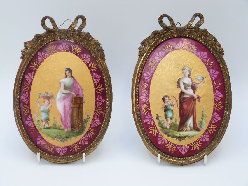 A pair of porcelain plaques in ormolu style frames (19cm tall)