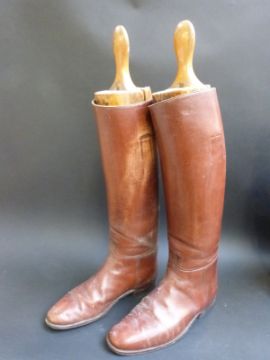 A pair of vintage leather riding boots with wooden trees, together with similar example, approximate size 10