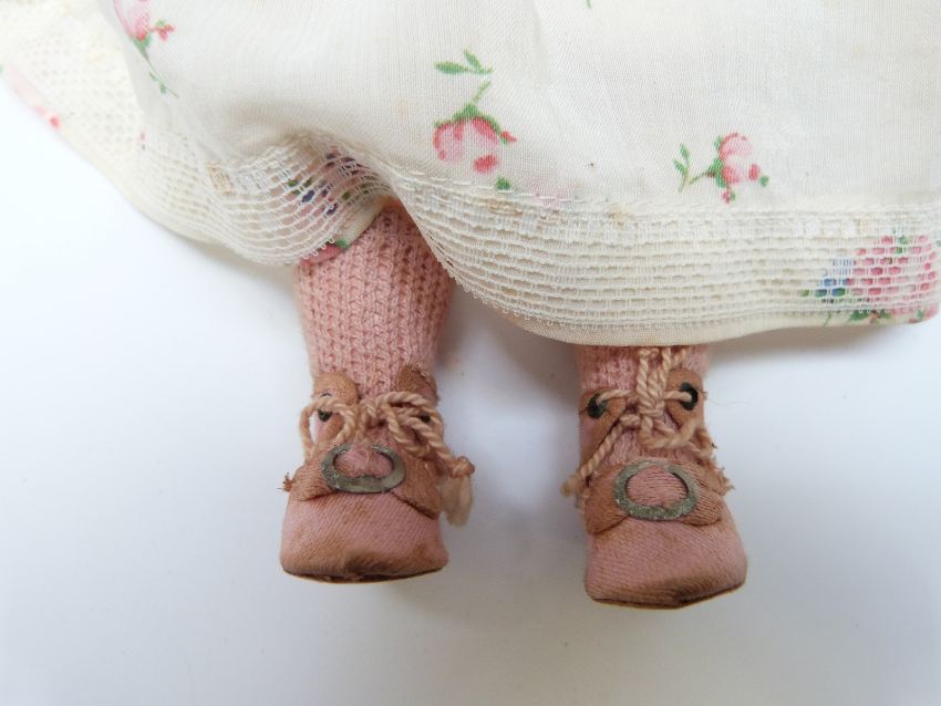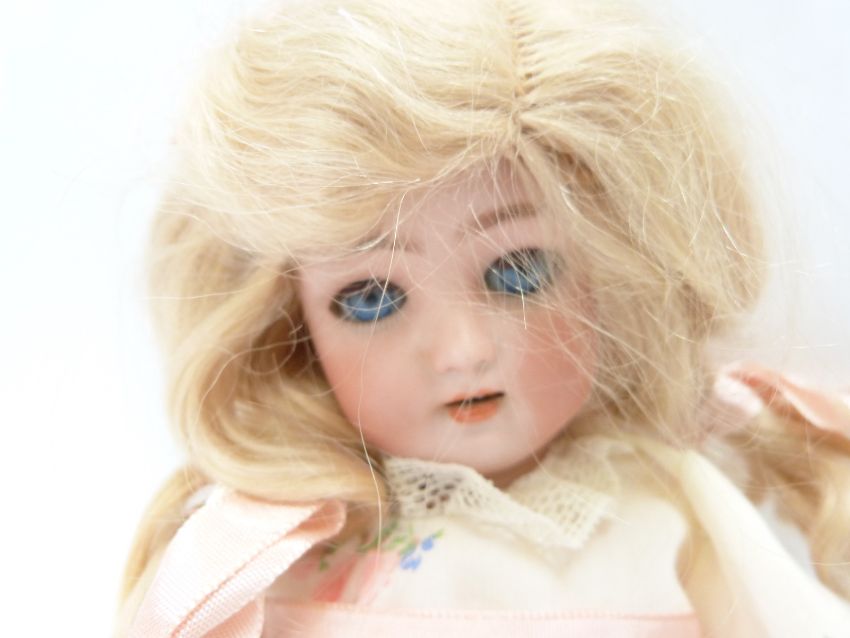 Simon & Halbig bisque headed doll with open mouth, weighted blue eyes, long blonde hair and articulated composition body, marked to the back of the neck 'Simon & Halbig S & H 4', in floral white dress with pink shoes, 32cm tall