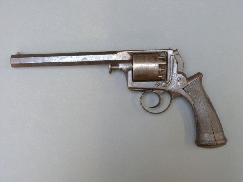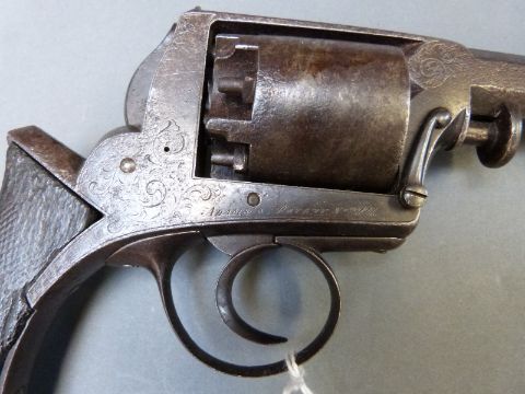 Adams 38 bore five shot Dragoon revolver with chequered grip, scrolling engraving and 7 inch octagonal barrel engraved 'Manuf by Angion & Cie Liege licensed by Deane Adams & Deane London', overall length 36cm