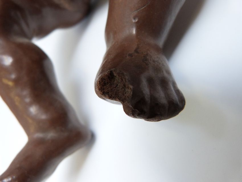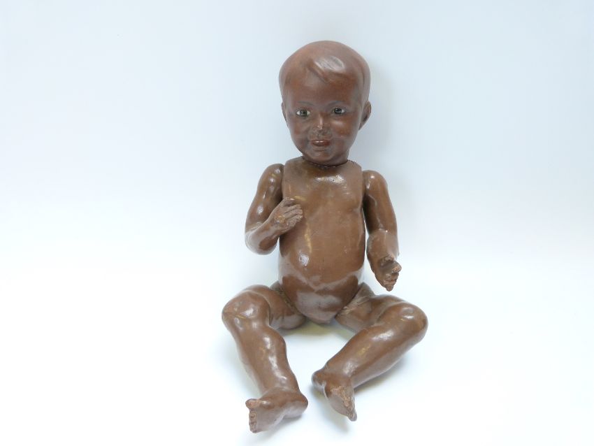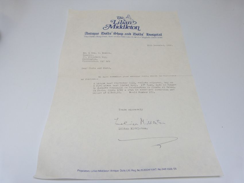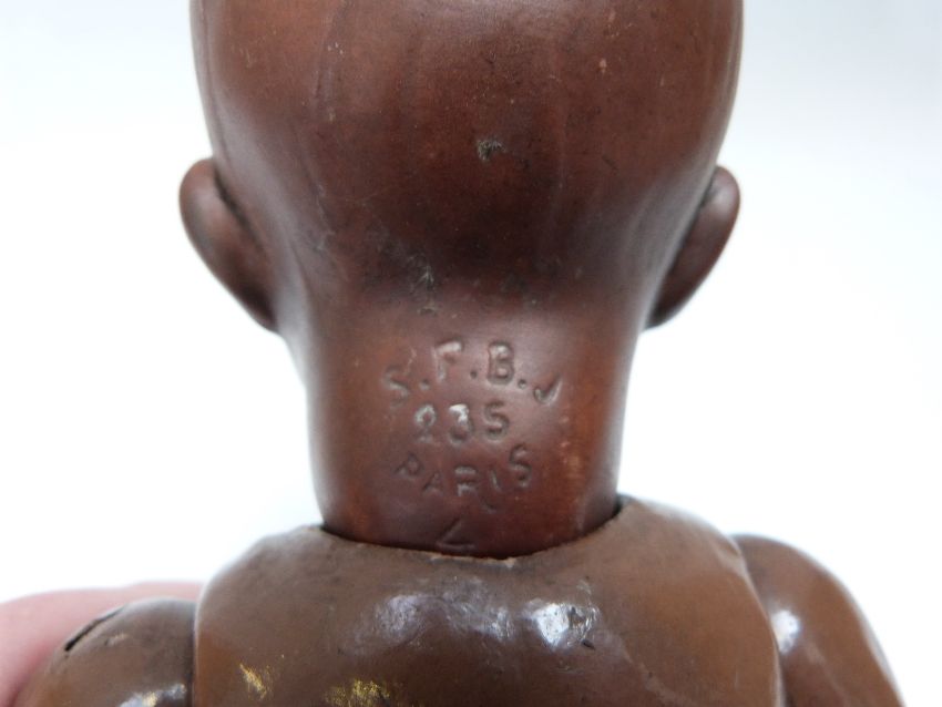 Societe Francaise de Fabrication de Bebes et Jouets (SFBJ) bisque headed mullato doll with open mouth, fixed brown eyes, moulded hair and jointed composition body, marked to the back of the neck 'SFBJ 235 Paris 4', 30cm tall, with valuation certificate from The Lillian Middleton doll shop and hospital, valuing the doll at £1,500 in 1990