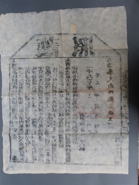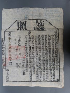 A 1913 Chinese passport with English Script 'Mr S.H De La Mare passport for the three Manchurian Provinces issued 8 March 1913, available for one year. Please observe endorsement added by Chinese Authority, not to be used for entering any place under Mongolian Jurisdiction'. Please note separate lots relating to De La Mare's sword and service record etc., lots 977 & 1446