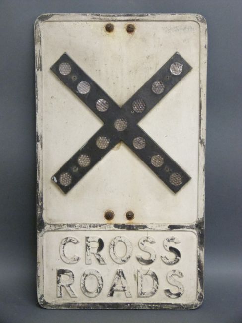 A vintage cast aluminium 'crossroads' road sign with honeycomb style reflectors, 53 x 30cm