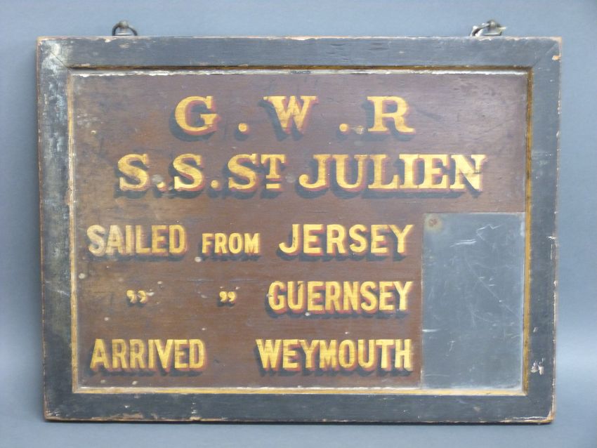 GWR double sided SS St Julien ferry sign Weymouth, Jersey, Guernsey with section for times to be chalked, 32x42cm