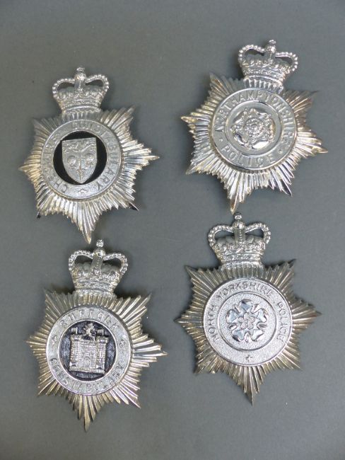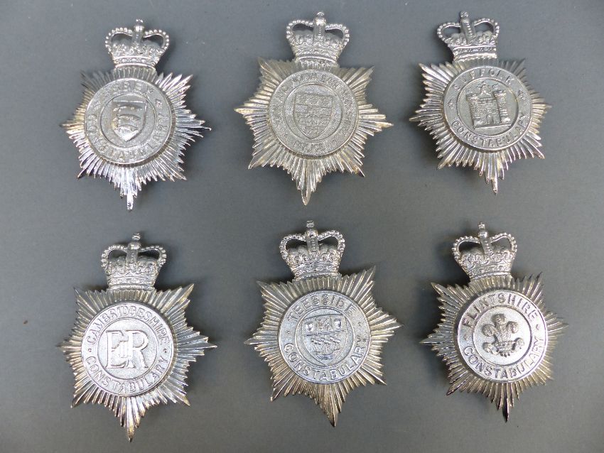 Ten police helmet badges including York North and East Yorkshire, Cambridgeshire Constabulary, Cheshire, Essex, Flintshire, Teeside, Suffolk etc