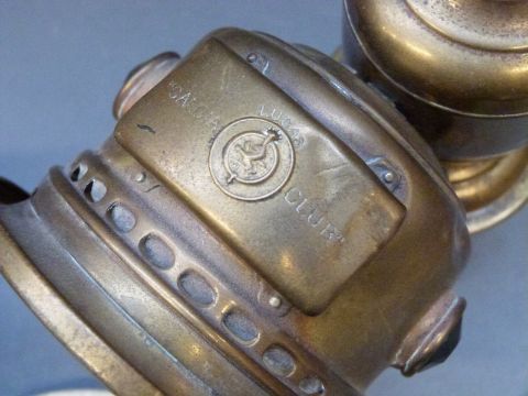 An unusual brass spot lamp possibly ex motorcycle or vintage car with plaque to top 20th Century Mfg Co. New York, a Lucas carbide lamp and an ashtray dated 1932 with motoring inscription
