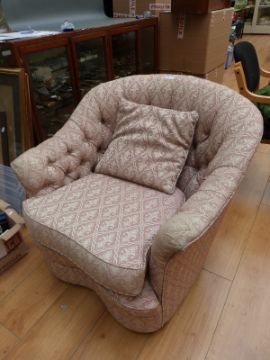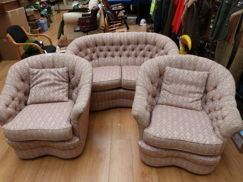A pink ground three piece suite with serpentine front, sofa 150cm