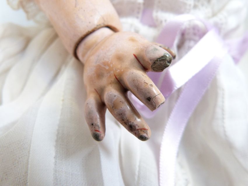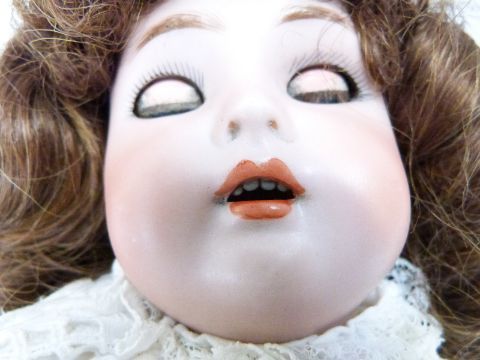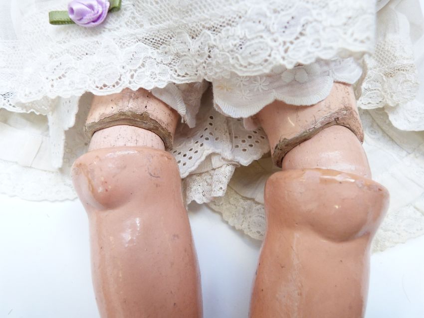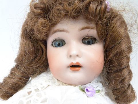Simon & Halbig bisque headed doll with open mouth, weighted blue eyes, pierced ears, curled brown hair and articulated composition body, marked to the back of the neck 'Simon & Halbig K star R 46', in white dress decorated with purple roses and ribbon, lace trim, and matching leather shoes, 47cm tall