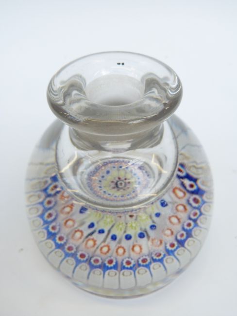 Stourbridge glass paperweight ink bottle with seven bands of multicoloured canes around a larger central cane, 98mm diameter