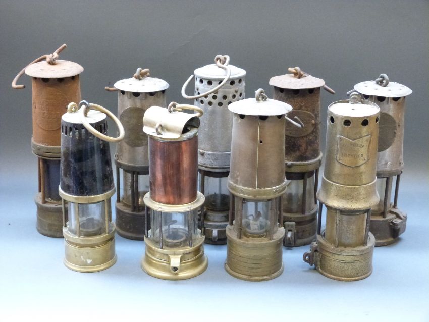 Nine various miners' lamps to include Naylor Wigan, Hulse Dresden, Howat's Patent, Ministry of Power etc