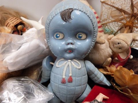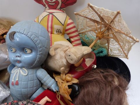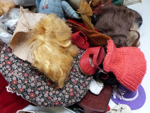 A collection of dolls, clothes, wigs and accessories