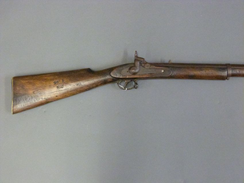 Enfield 2-band percussion hammer action gun with brass butt plate and trigger guard, indistinctly marked lock, stock stamped 284 over 386 and 31.5 inch barrel stamped 240/83, overall length 122 cm.
