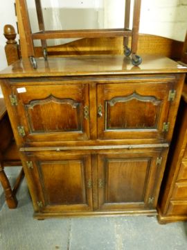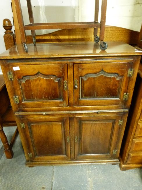 An oak drinks cabinet with twin cupboards and central brush slide (H110 x W91 x D40cm)