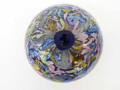 Fratelli Toso oversized millefiori glass paperweight of hollow form decorated with scrambled canes and latticino tubes on mottled blue ground, 17.5cm in diameter
