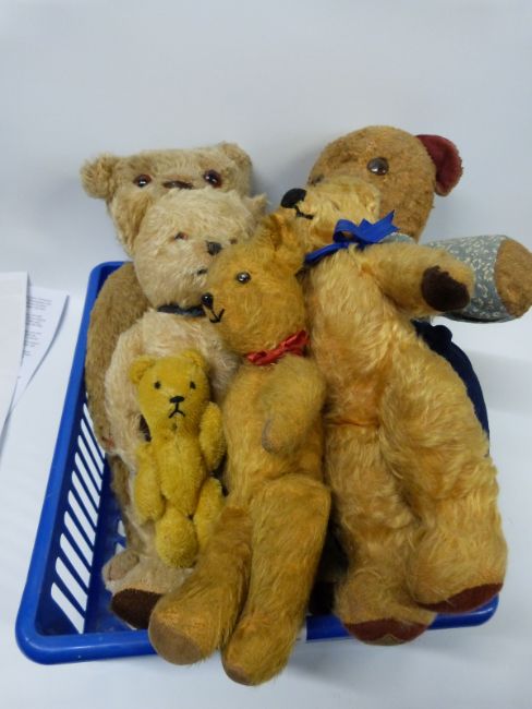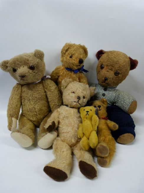 Six blonde teddy bears including a Steiff miniature example, some with growlers, largest 44cm tall