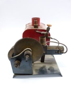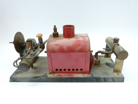 A steam plant comprising a horizontal copper boiler connected to a Bowman Models 101 steam engine with oscillating cylinder in fixed outer case and secondary gear shaft
