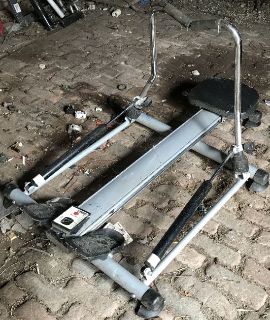 A vintage exercise bike together with a compact rowing machine.