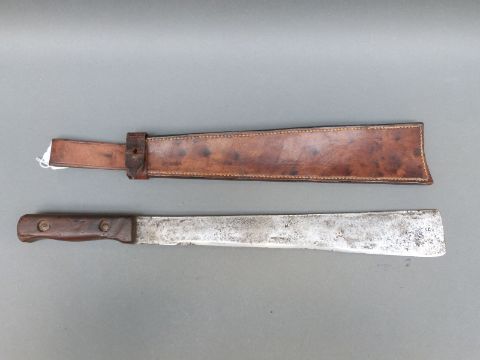 A WWII 1945 machete impressed MKII MIL45 in leather sheath and also dated 1945