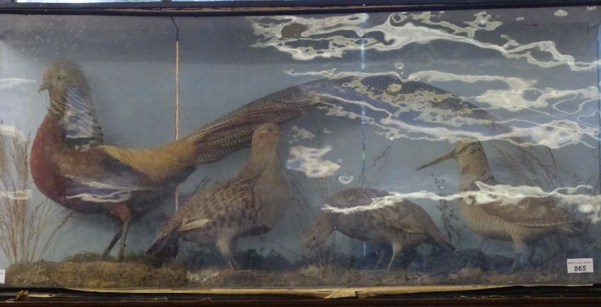 A taxidermy study bird group comprising a golden pheasant, partridge and a woodcock, in glazed case, 45 x 99cm.