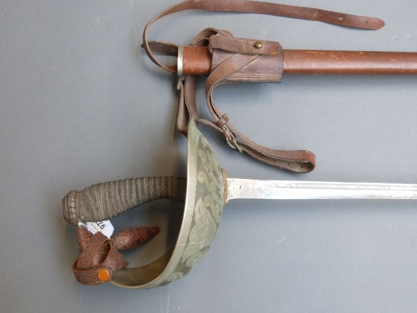 A 1912 pattern cavalry officer's sword in scabbard with leather frog attachment. The blade with George V cypher, etched to blade Stanley H De La Mare.Stanley de la Mare was born in 1876 and served with the British South African Police for 12 months, leaving in 1898 and joining the 49th Company Imperial Yeomanry to fight in the Boer War. He was then commissioned into the Montgomeryshire Yeomanry on 10/10/1914 and was mentioned in dispatches on 13/11/1916. He served with the Royal Engineers Tunnelling Company from November 1915 to March 1918 and after the war served with the 53 Welsh Division. See also lot 1447 and 1446 relating to De La Mare.
