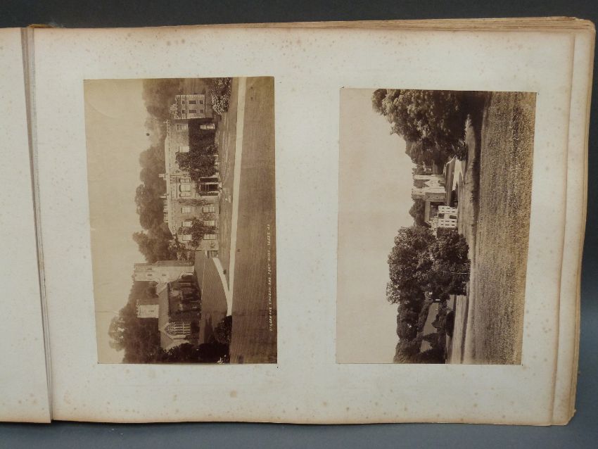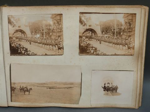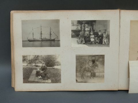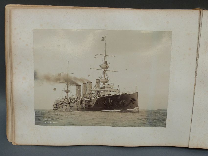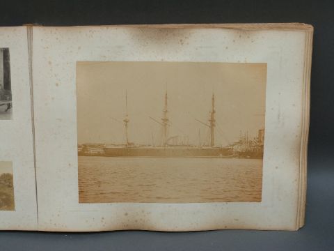 A Victorian naval photograph album, possibly following one man's progression, beginning with training onboard HMS Northampton and following on with HMS Powerful, HMS Royal Arthur, HMS Iris and HMS Queen. Scenes include possible Colonial scenes, mass graves, divers in suits, exercising on deck, ball onboard a ship, pig sticking, Lake Cowal 1899, polo, crew photographs, Constantinople, torpedo with crumpled end etc