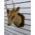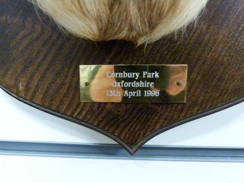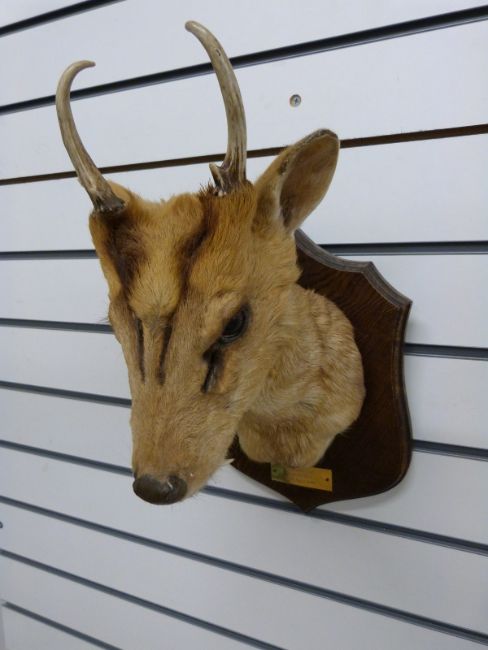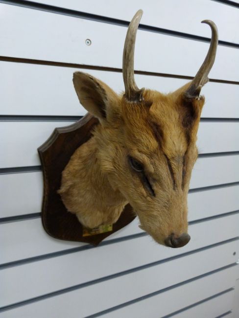 A taxidermy study muntjac head and shoulder mount on wooden plaque