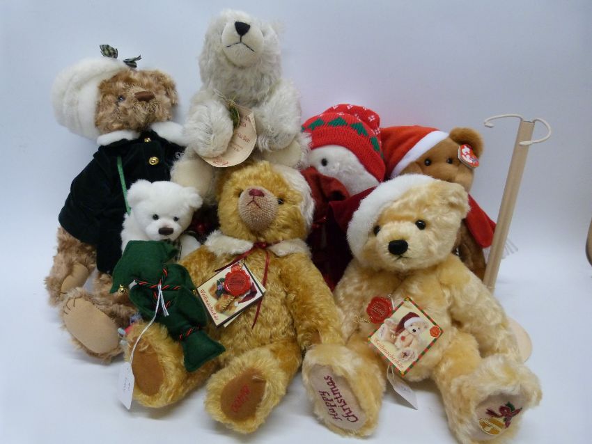 A collection of Hermann Original and other teddy bears, some musical including 'Christmas' teddy bear, limited edition 8/400; Hermann 'Polar Bear'; Hermann musical teddy bear; Gund Barton's Creek collection 'Ashley' teddy bear, limited edition; TY Beanie Christmas Teddy Bear and Snowman; Walt Disney Company 'Santa Pooh', limited edition 277/3500 and nine Walt Disney Company Winnie the Pooh characters