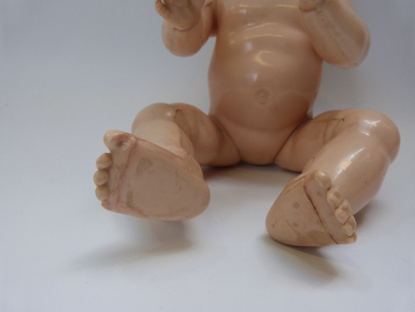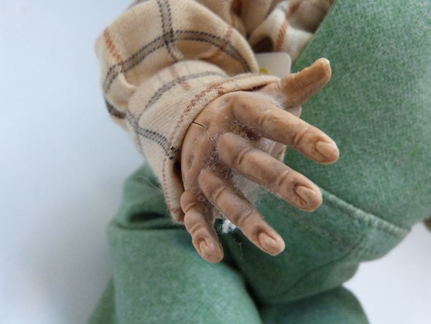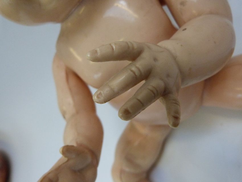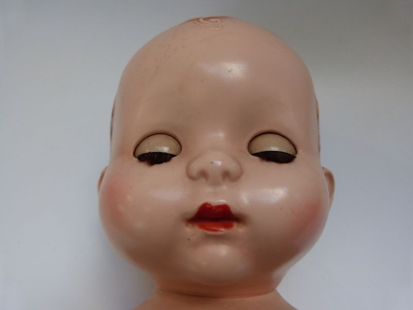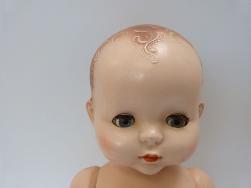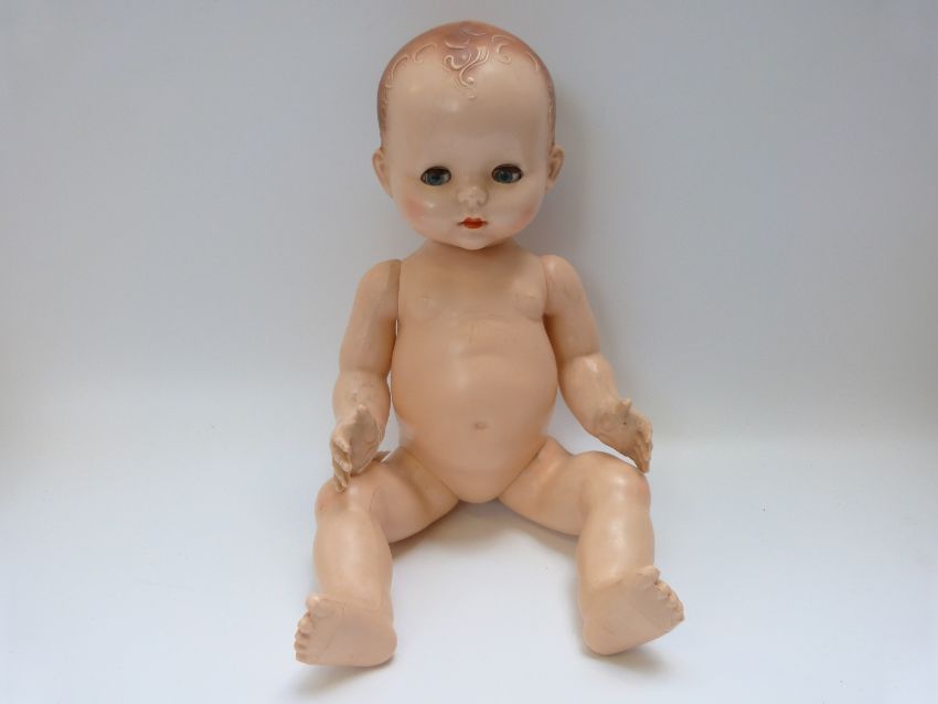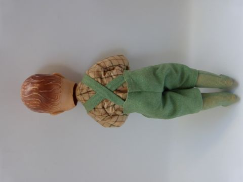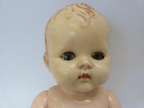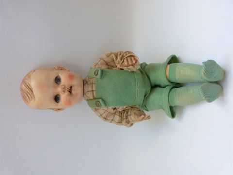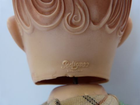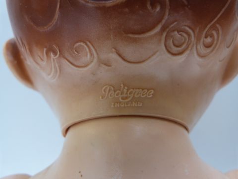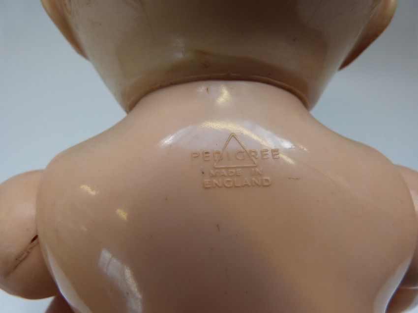 Three Pedigree dolls, all with weighted eyes and jointed bodies, one in green overalls, largest 50cm tall