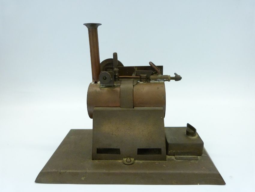 A horizontal overtype stationary steam engine with oscillating cylinder, regulator and two wick methylated spirit burner, possibly a schools project