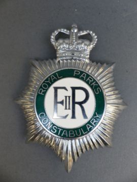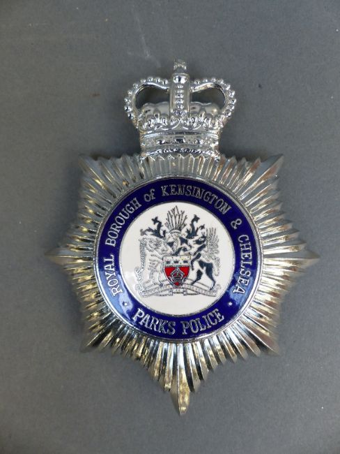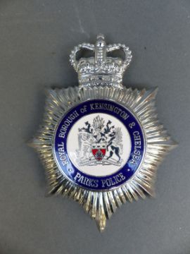 Two enamel police helmet badges comprising Royal Borough of Kensington and Chelsea Parks Police and Royal Parks Constabulary