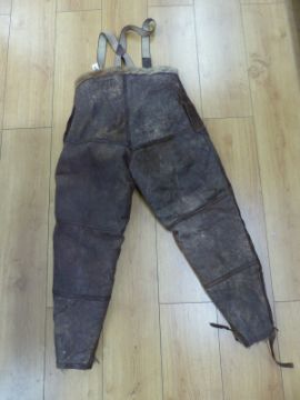 Royal Air Force Irvin flying trousers, brown leather with wool interior, complete with Air Ministry label size 4 and original braces