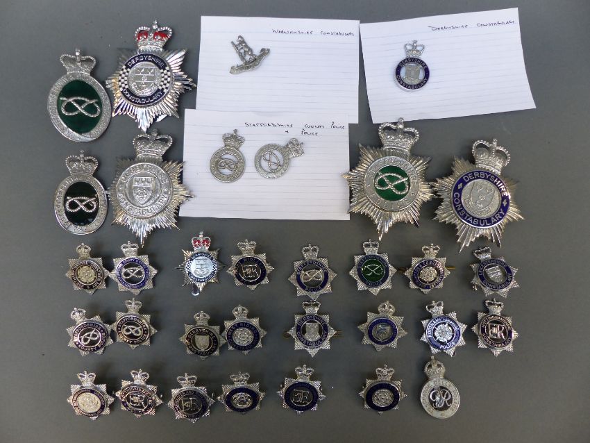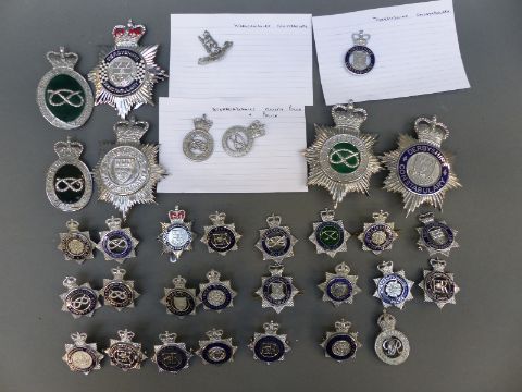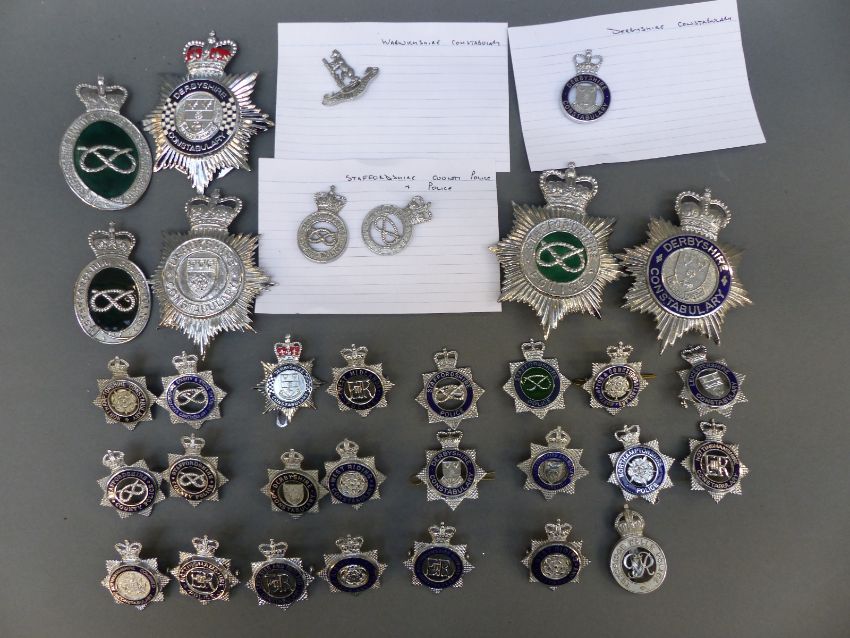 A collection of various police badges including Derbyshire, Staffordshire, Warwickshire, West Midlands, Leicester and Rutland