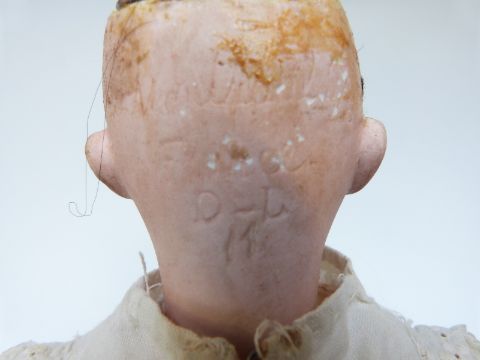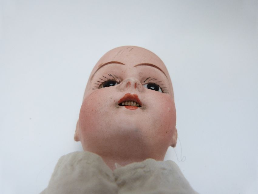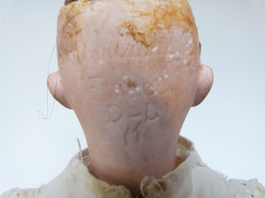 Damerval & Laffranchy bisque headed doll with open mouth, fixed brown eyes and jointed composite body, marked to the back of the neck 'Montrevil France D-L 11', in white dress, 36cm tall
