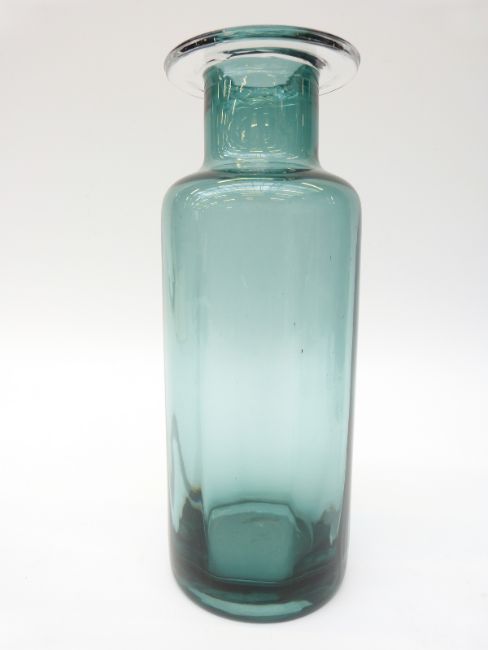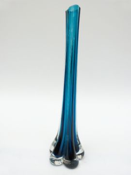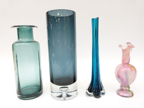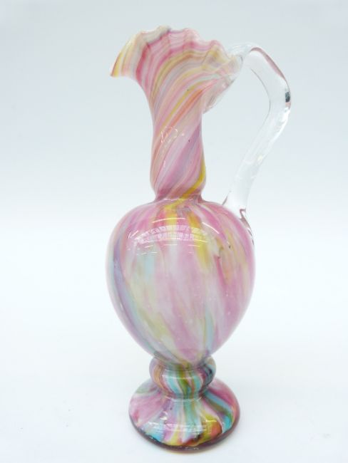 Three glass vases, one with suspended bubble base together with a Murano style multi-coloured glass ewer, largest 28cm tall