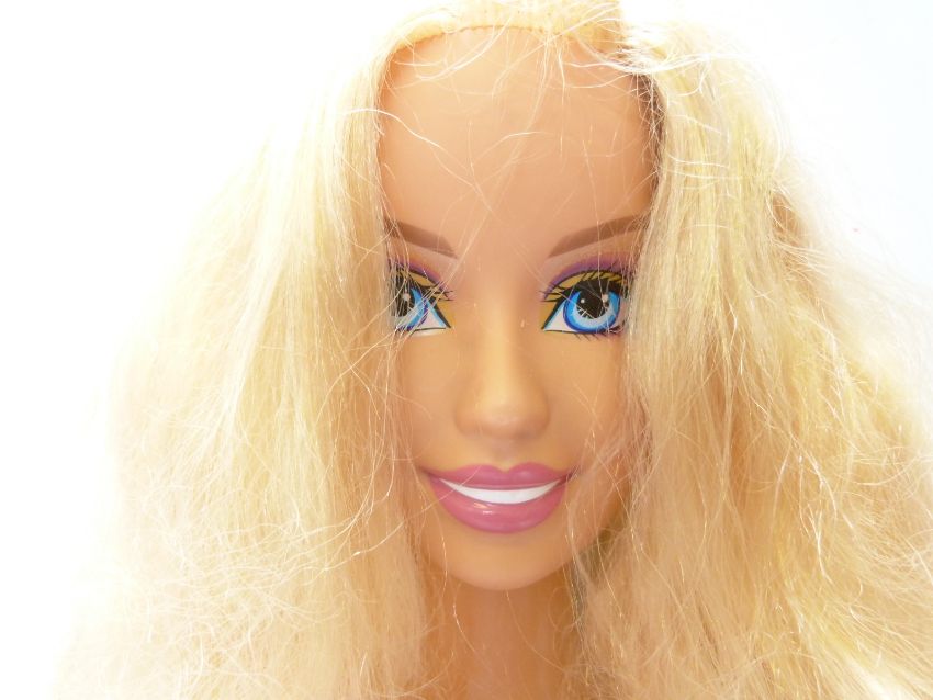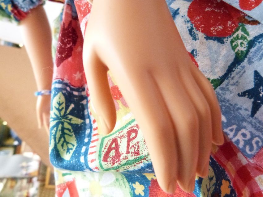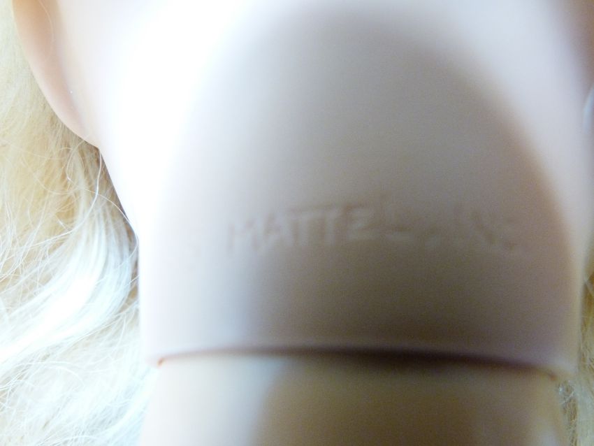 Mattel doll with painted mouth and eyes, blonde hair and jointed limbs in patchwork style dress and pink shoes, 98cm tall