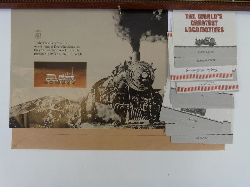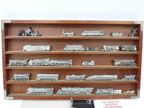 Twenty-five Franklin Mint 'The World's Greatest Locomotives' miniature pewter model trains, in wooden display case with information booklets etc