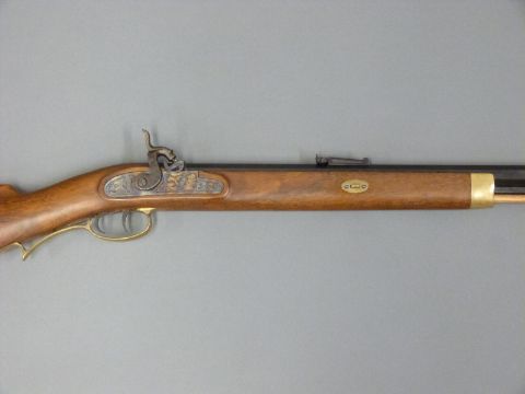 Italian .451 Kentucky style rifle with deeply engraved lock, brass butt plate, trigger guard and mounts, storage compartment to the stock and named 28inch octagonal barrel, overall length 114cm, serial number 235812