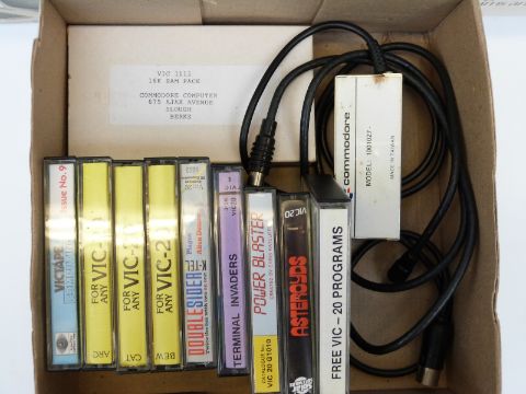 Vic-20 colour computer in original box, modulator, 16k ram pack and a selection of games