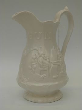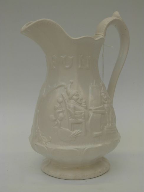 A decorative ceramic jug with a Punch and Judy show decoration (26cm tall)