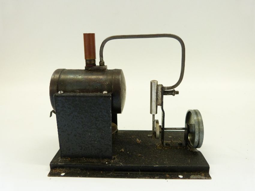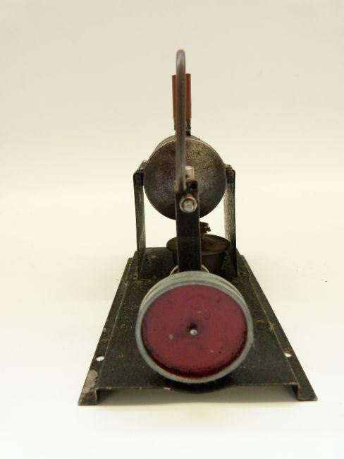 'The Toytown Flyer' c1950 live steam stationary steam engine manufactured by Harbour Engineering, with boiler and oscillating cylinder, mounted on a metal bed plate