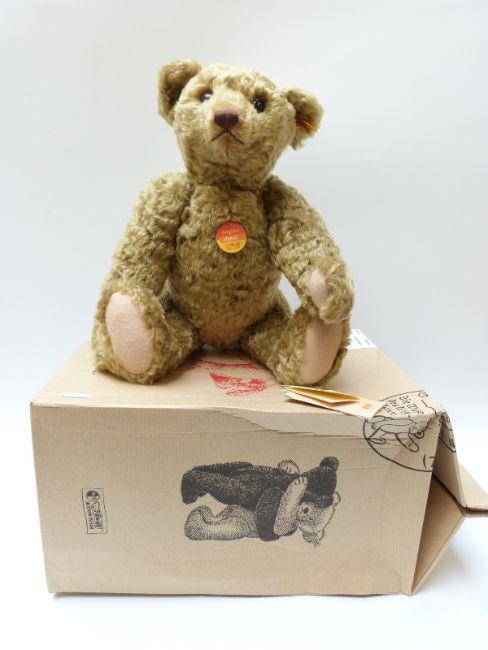 Steiff Original Classic teddy bear 4285, with gold colour mohair, button to ear and tags, 40cm tall, in original snap close box