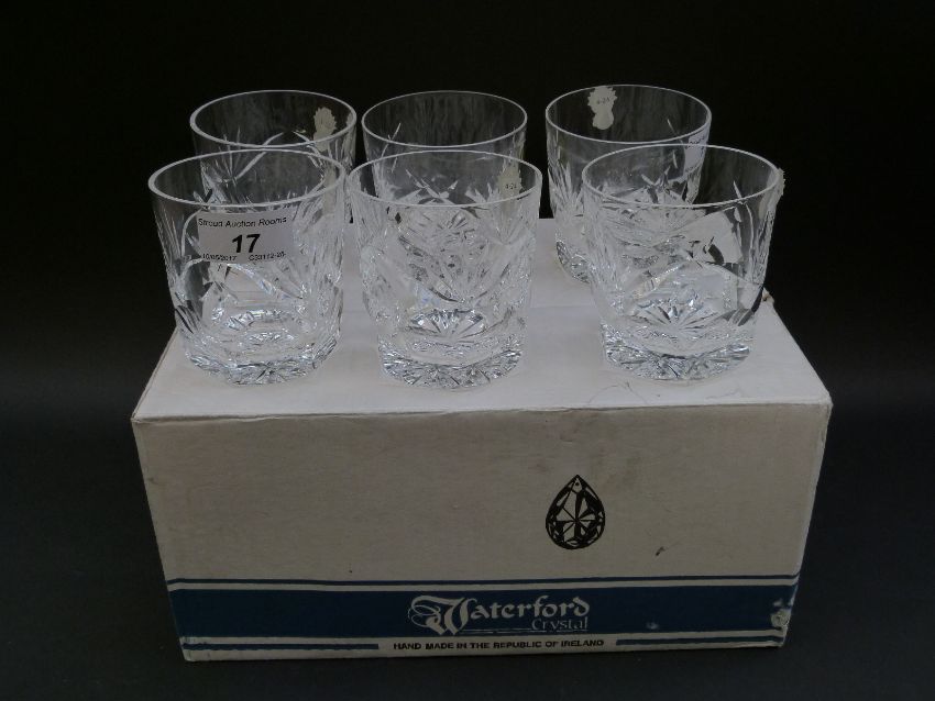 A set of six Waterford Crystal tumblers in Ashling pattern, 8.5cm tall, in original box