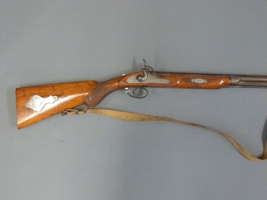 Single barrel percussion hammer action muzzle loading gun with engraved lock and hammer, chequered semi-pistol grip and forend, storage compartment to stock, sling and 32 inch barrel, overall length 121cm