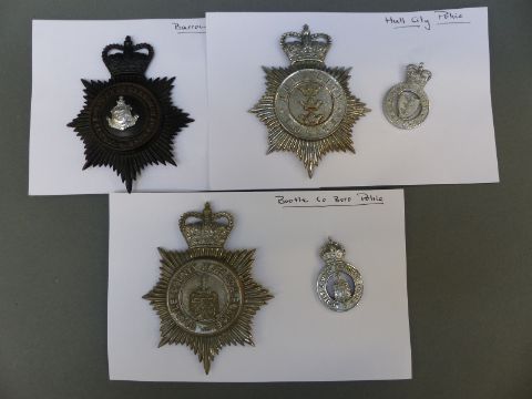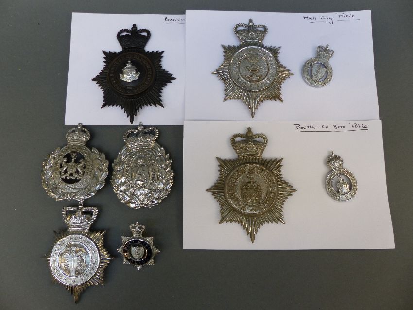A collection of police badges including Sunderland, Newcastle-upon-Tyne, Birkenhead, Hull City, Bootle and Borough, Barrow-in-Furness etc