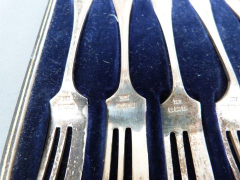 A cased set of six hallmarked silver cake forks Birmingham 1914, maker Charles Wilkes, weight 101g