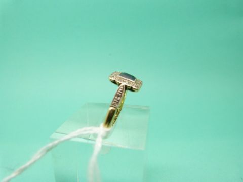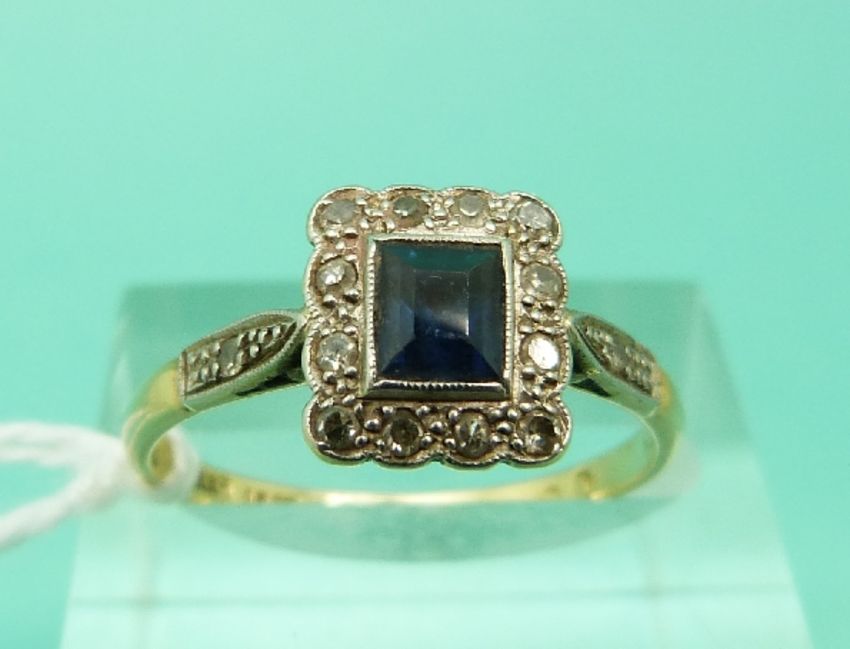 An 18ct gold ring set with a rectangular cut sapphire surrounded by diamonds in a platinum setting (Size P)