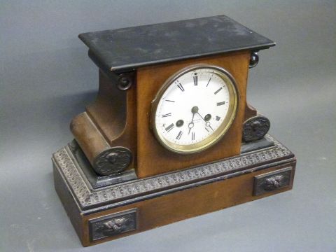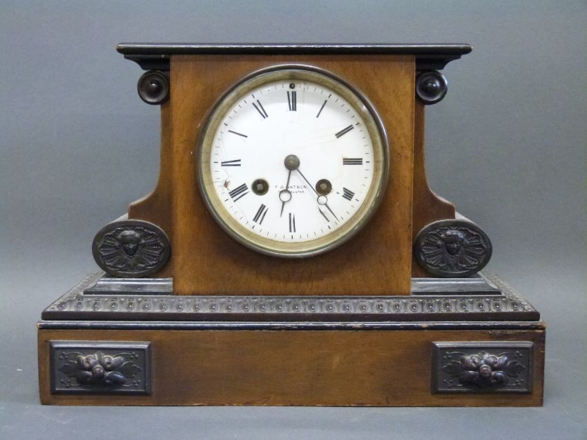 F J Watson Manchester late Victorian mantel clock with ebonised decoration to carved case and enamel Roman dial with Breguet hands, 21cm tall
