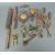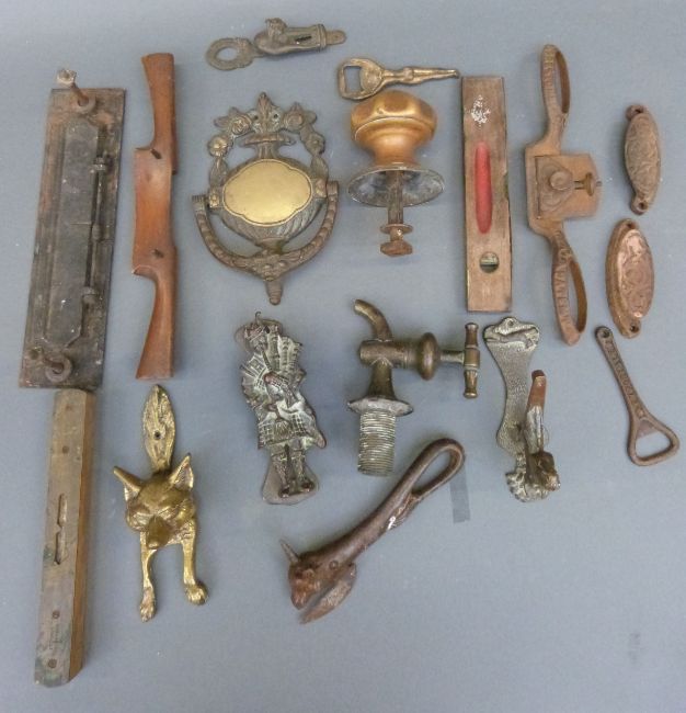 A collection of brass door knockers together with spokeshaves, spirit levels etc.
