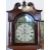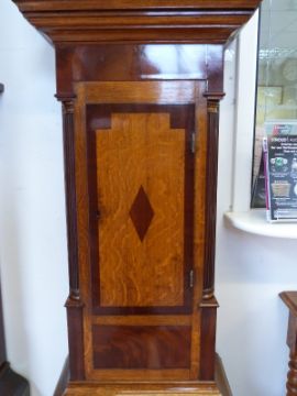 Mid nineteenth century 30 hour long cased clock in oak and mahogany cross banded case with reeded quarter columns, the hood with swan neck pediments, the painted arched Roman dial with secondary date and seconds dials, decorated with fox and hounds to corners, maritime scene to arch. S.Wilke Birmingham to dial back plate, dated 1886 and 1903, 223cm tall