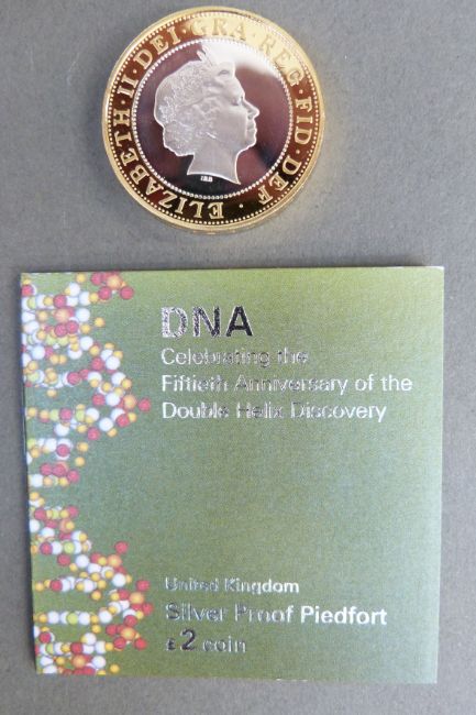 Four cased silver proof UK coins comprising a Double Helix Discovery anniversary £2 Piedfort, a 2002 £1 Piedfort, a silver proof WWII £2 and a School Libraries 50p, all with certificates